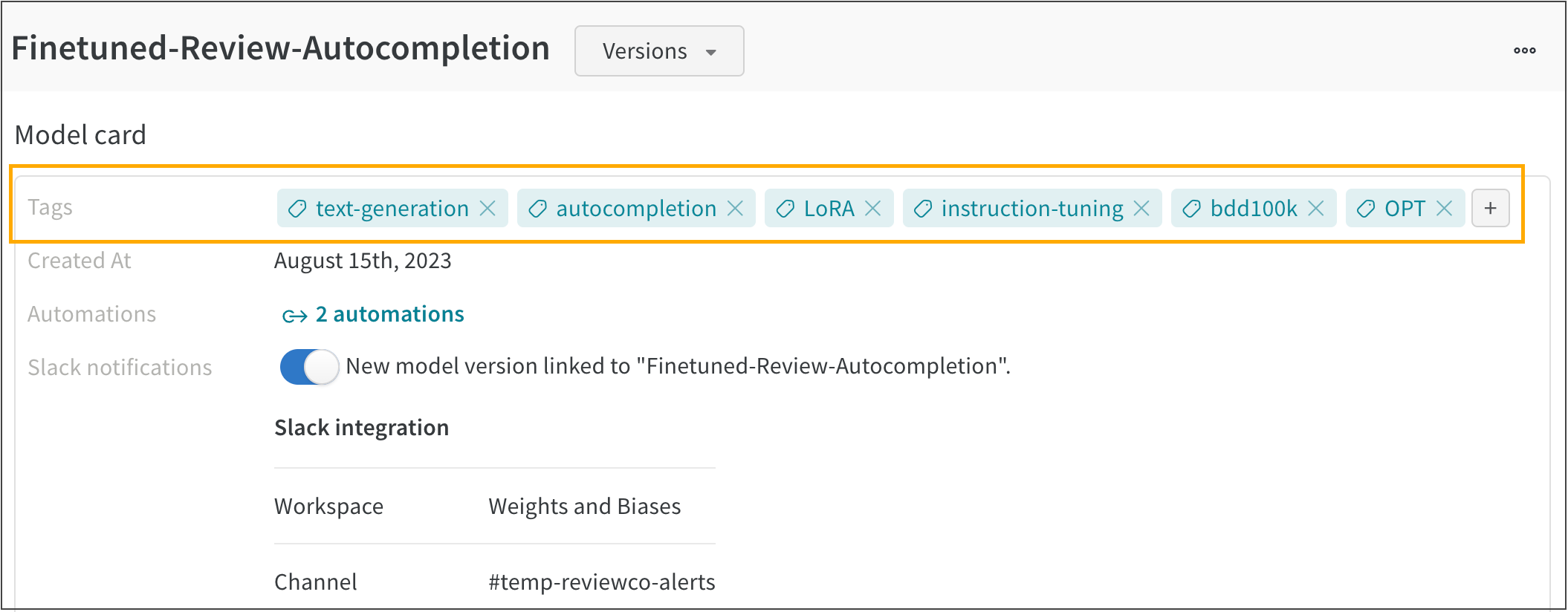 例えば、次の画像は FineTuned-Review-Autocompletion という登録済みモデルに複数のモデルタグが追加されている様子を示しています。