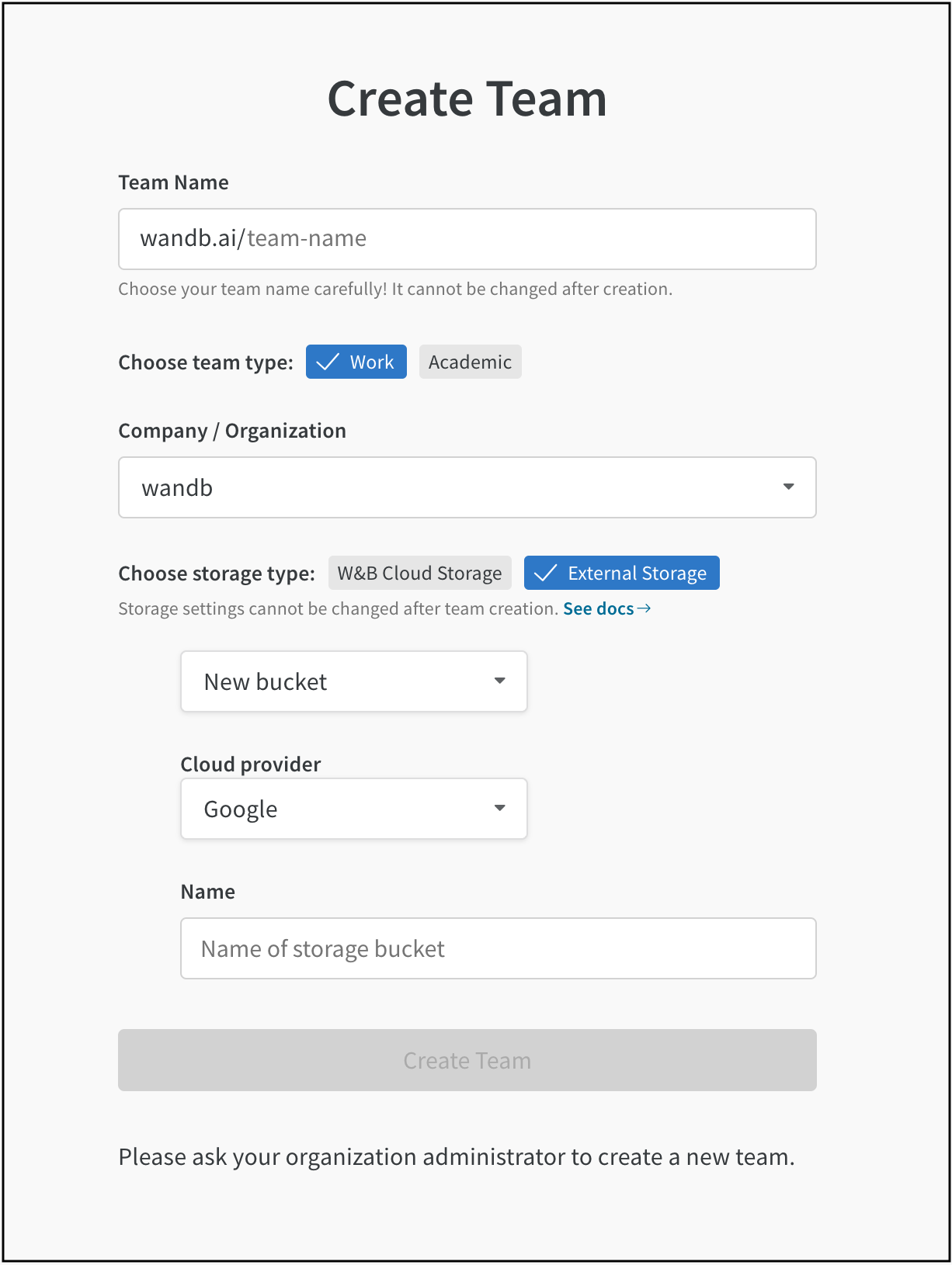 - ドロップダウンから 新しいバケット を選択するか、既存のバケットを選択します。 複数の W&B チームが同じクラウドストレージバケットを使用できます。これを有効にするには、ドロップダウンから既存のクラウドストレージバケットを選択してください。
