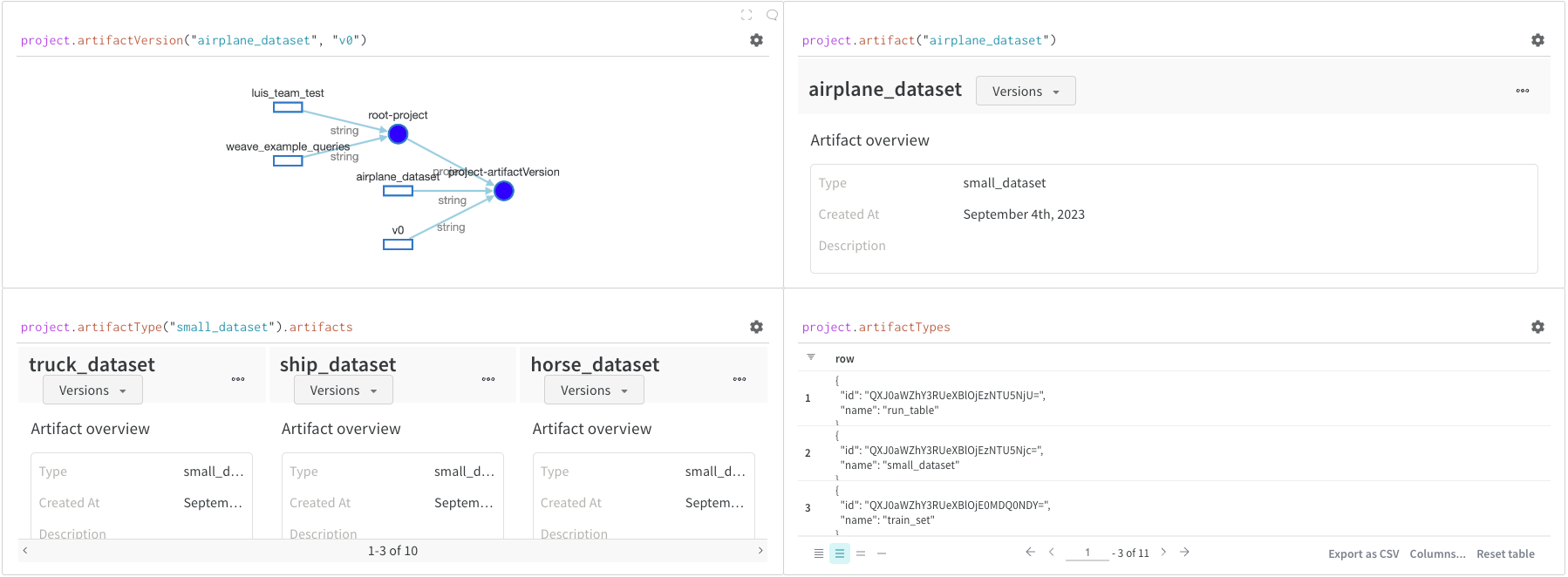 - project.artifactType(): 프로젝트 내에서 주어진 이름에 대한- artifactType을 반환합니다. 그런 다음- .artifacts를 사용하여 이 유형의 모든 아티팩트 목록을 가져올 수 있습니다.