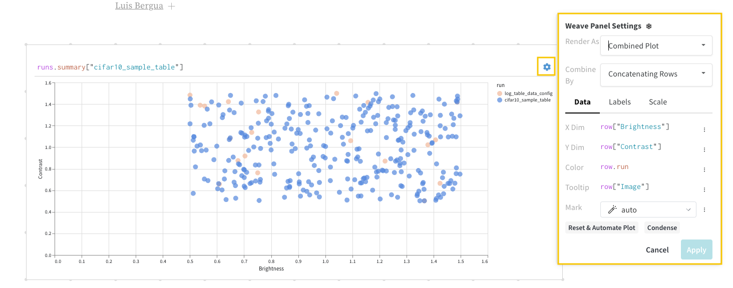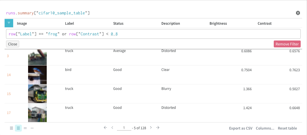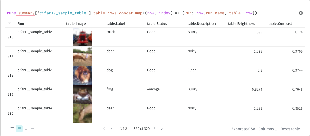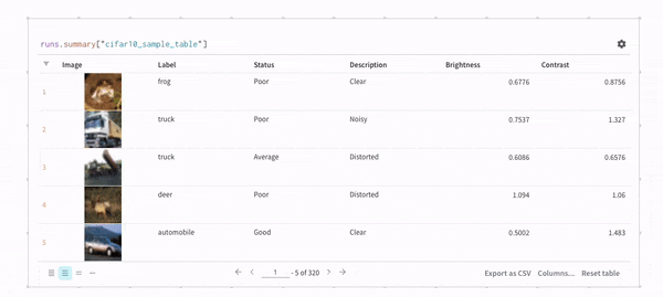 W&B Table을 쿼리한다고 가정합니다. 트레이닝 코드에서"cifar10_sample_table"이라는 테이블을 로깅합니다: