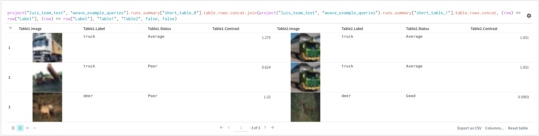 - ["cifar10_sample_table"]은- predictions파라미터가 있는 Pick op(대괄호로 표시)입니다. Summary 오브젝트는 사전 또는 맵과 같이 작동하므로 이 작업은 각 Summary 오브젝트에서- predictions필드를 선택합니다.