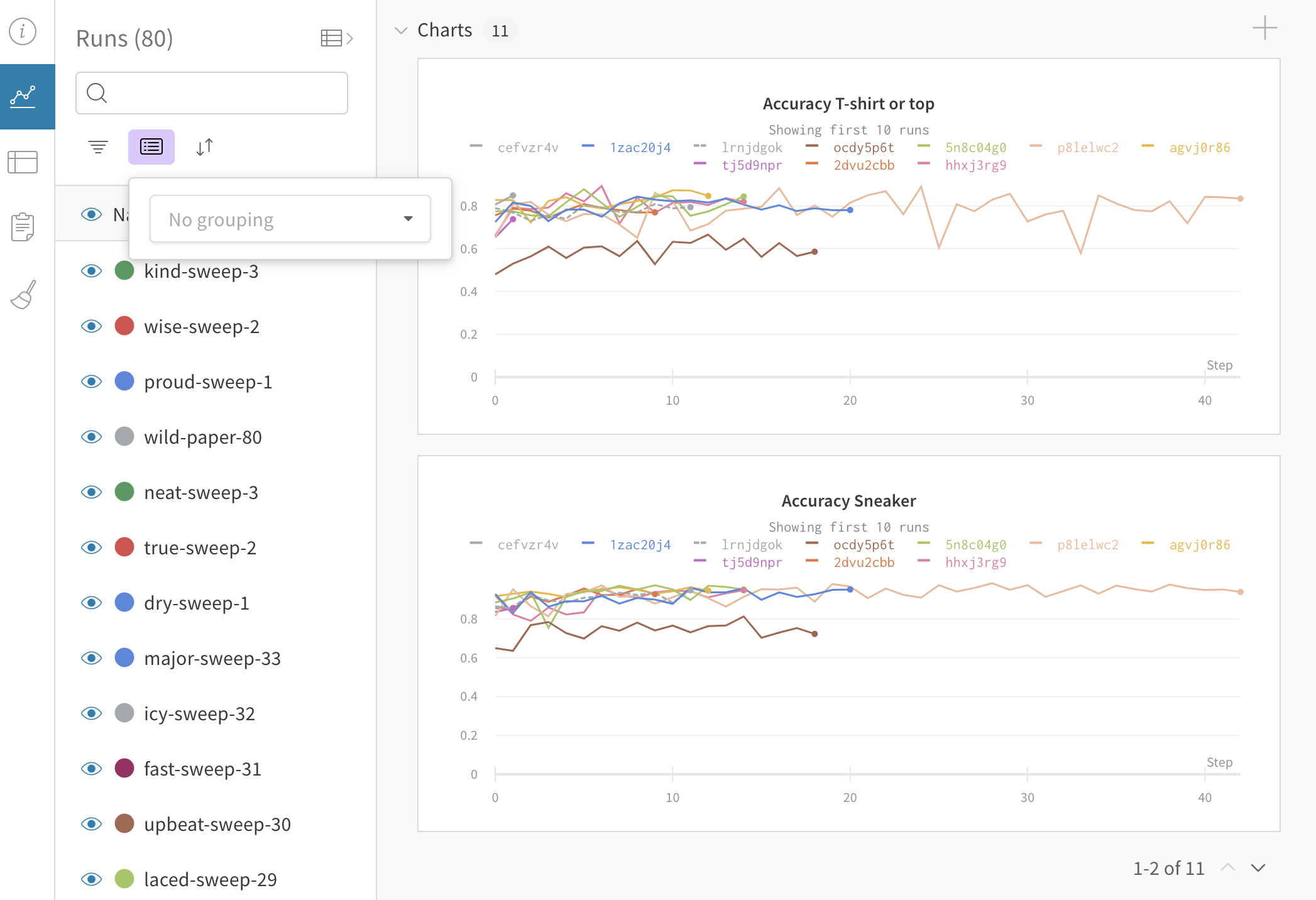 예를 들어 하이퍼파라미터별로 열별로 Runs 를 그룹화할 수 있습니다. 다음은 그 모양의 예입니다.- 사이드바: Runs 는 에포크 수별로 그룹화됩니다.